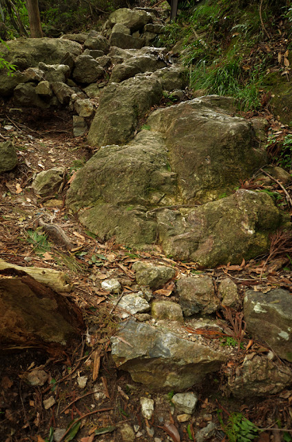 本堂の裏には、登山者向け(?)の道があります。ちょっと気になり登ってみると、荒れ放題の道に加え、急傾斜の連続。軽装且つ、子連れでは通ってはいけない道へ入ってしまった感が…。