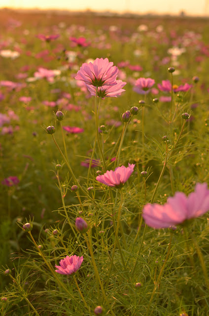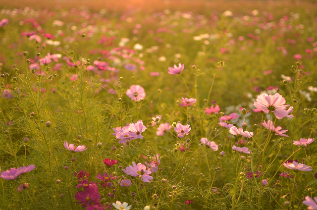 夕暮れとコスモスの組み合わせは格別です。最近はわざとフレアさせるのがマイブームです。太陽の温かい雰囲気を撮れた気になっています(笑)