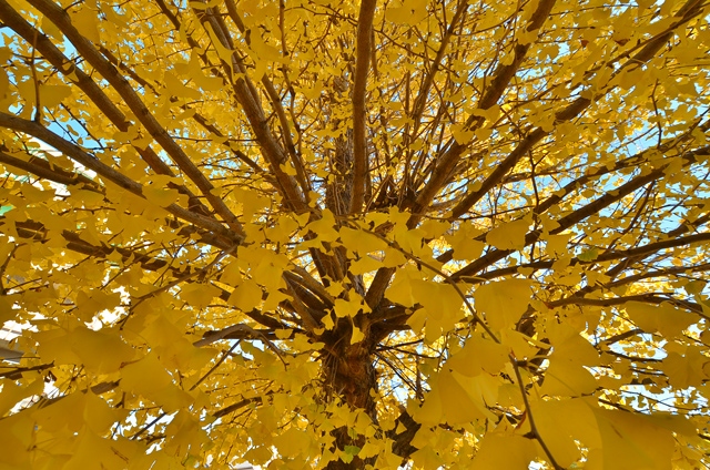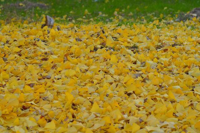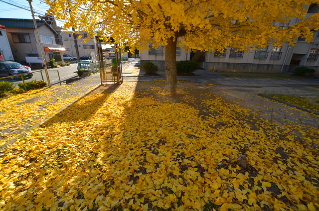ここは団地の敷地内にある銀杏ですが、落ち葉の収集も間に合わないくらい沢山落葉していました。御覧の通り、切り株にはぎっしり銀杏の葉が…。