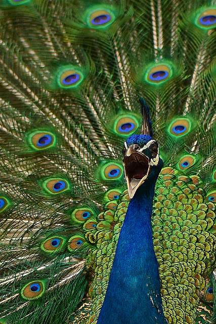 孔雀のアップ。ちょうど雄叫びを上げている所が撮れました。