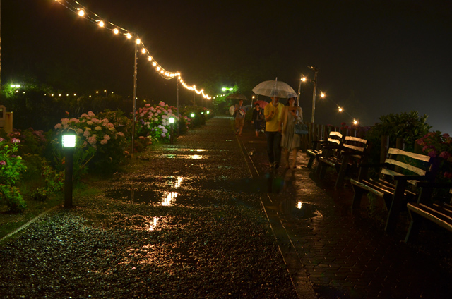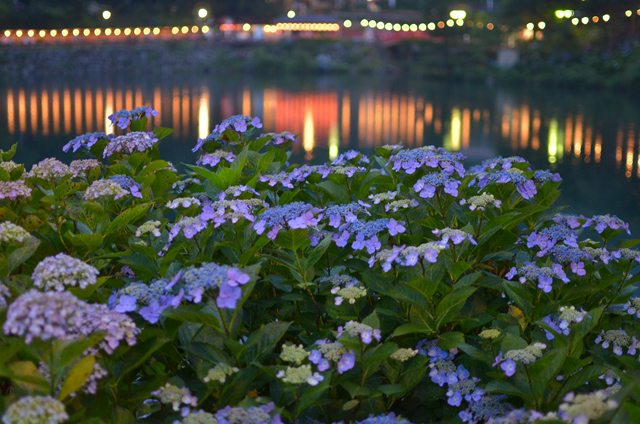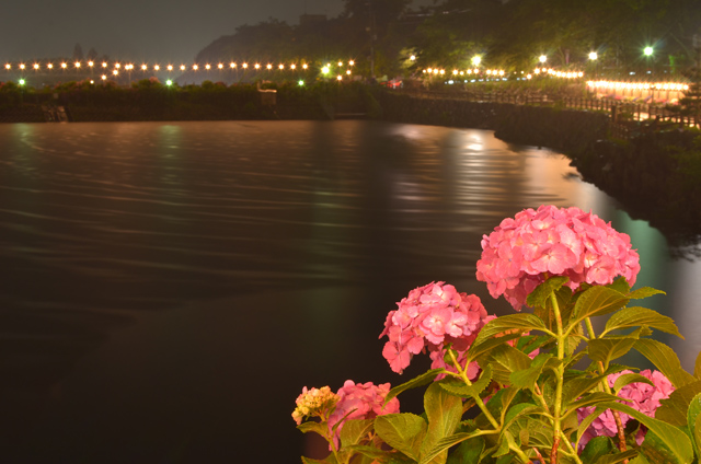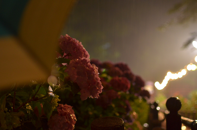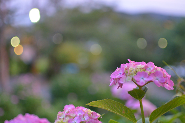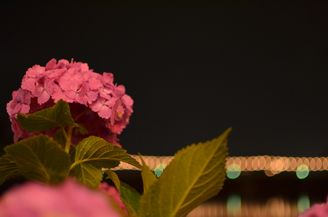 今回は35mm F1.8GとSIGMA 10-20mm F3.5を持って行きました。35mm F1.8では点光源ぼけが綺麗に撮れる事を今更ながら知りました。最短距離まで被写体(あじさい)に近づき背景(ライト)を写すとなかなり大きいボケになります。最短まで近づいた場合はある程度絞って撮ったほうが良いかもしれない…レンズキット等のズームレンズではこうは写りません。